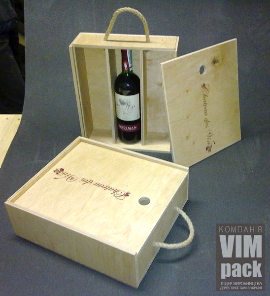 Ящик-пенал під 2 пляшки (або пляшку і бокали), розмір кожного відділення 90х90х330мм, загальний внутрішній розмір 330х188х90мм, ручка, без лого. |